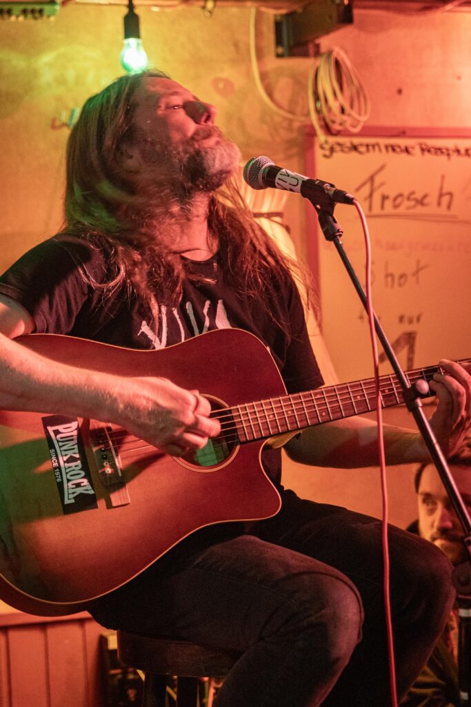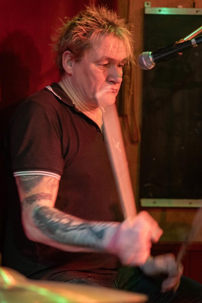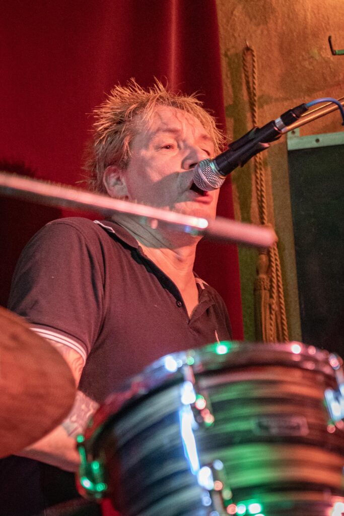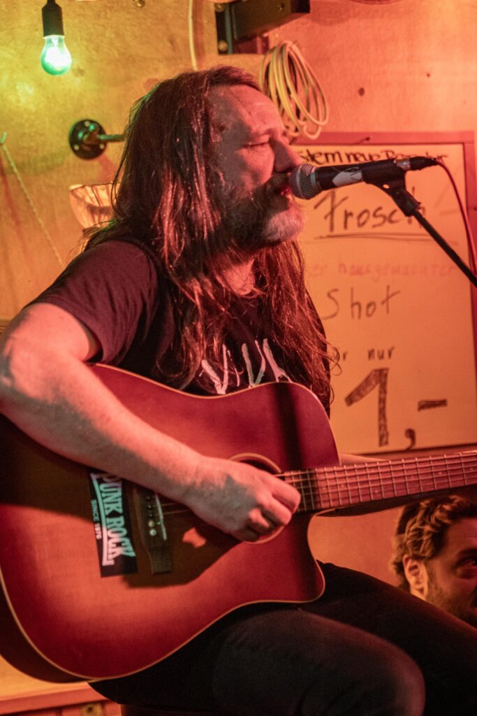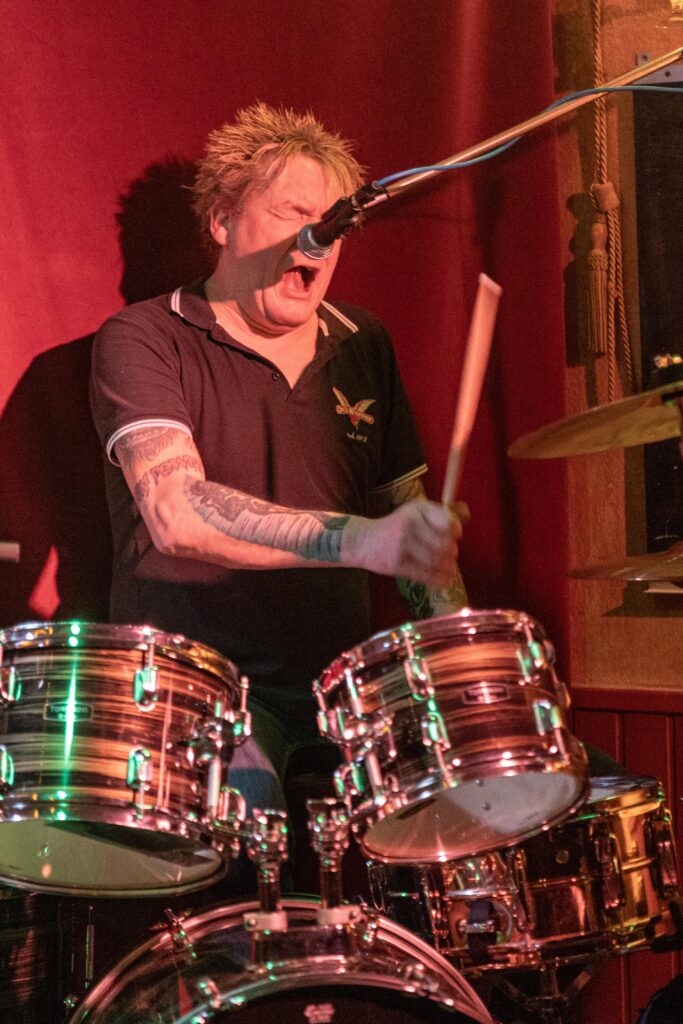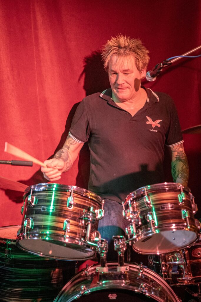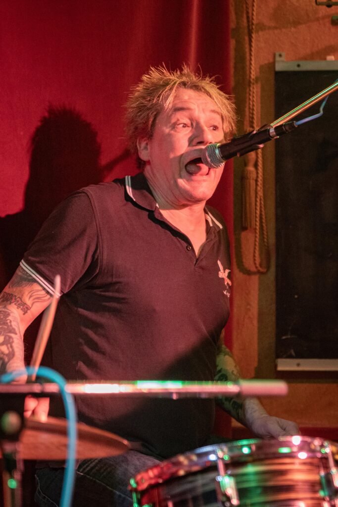 Eintritt war frei, ein Hut ging rum, der auch recht gut gefüllt schien. Sauber! Mit „Blitzkrieg Bop“ ging’s los, doch der Darmstädter Pöbel brauchte noch zwei, drei Songs, um richtig auf Temperatur zu kommen. Das kommt halt davon, wenn der Veranstalter zu geizig für eine Vorband ist, haha. Nach Hits von TV Smith und den Ärzten (oder waren es doch die Suurbiers?) wurde dann doch ziemlich schnell auch in den hinteren Reihen mitgeträllert. Drummer Berny machte ein paar böse Ansagen, die ihn fast den Rausschmiss aus der Band gekostet hätten. Aber mal ehrlich: Wer sein Bier so elegant in einer Gitarrenhalterung abstellen kann, den wirft man nicht einfach so raus. Niemand in der Kneipe hatte erwartet, dass das den ganzen Abend gut geht. Die Stimmung kippte nochmal ganz kurz, als irgendein Honk auf die Bühne gebeten wurde, um die „Schwarzwaldklinik“ von den Toten Hosen zu singen. War aber zum Glück schnell vorbei, und nichts ging zu Bruch.
