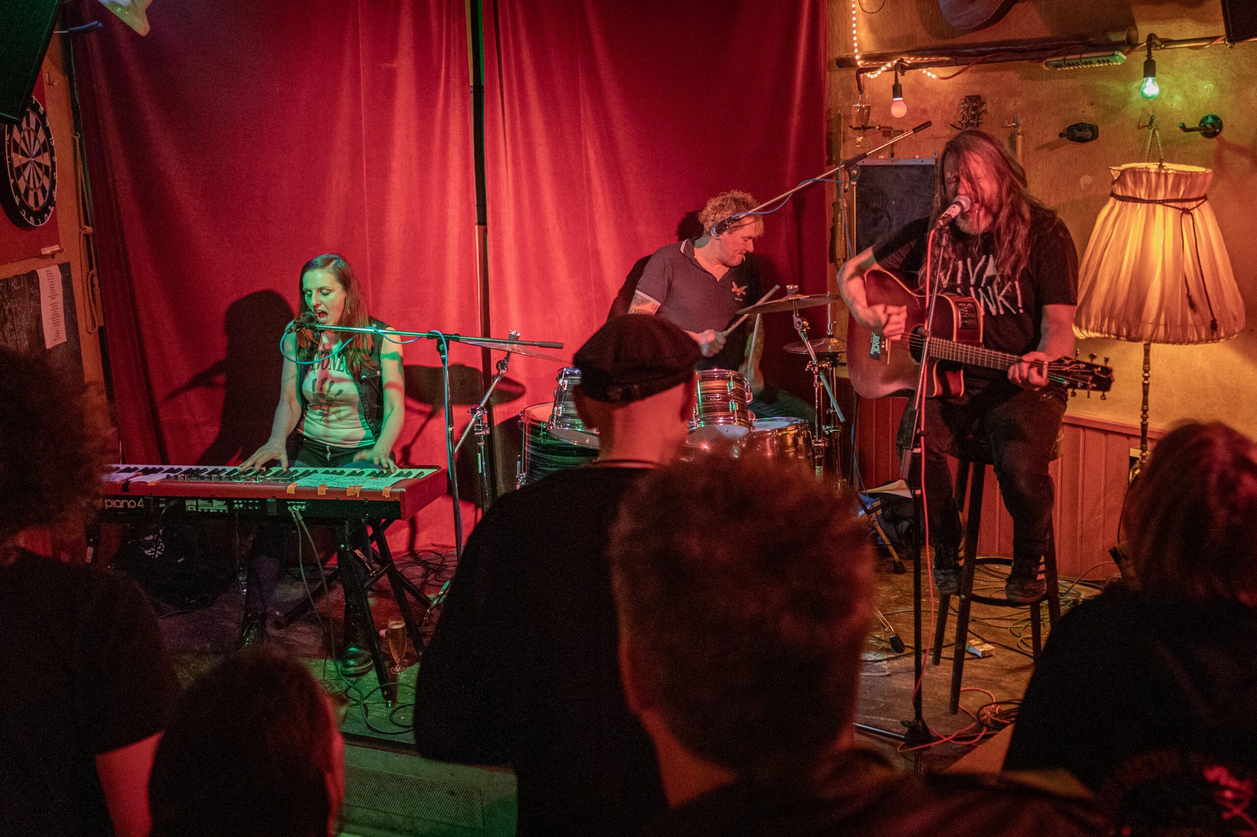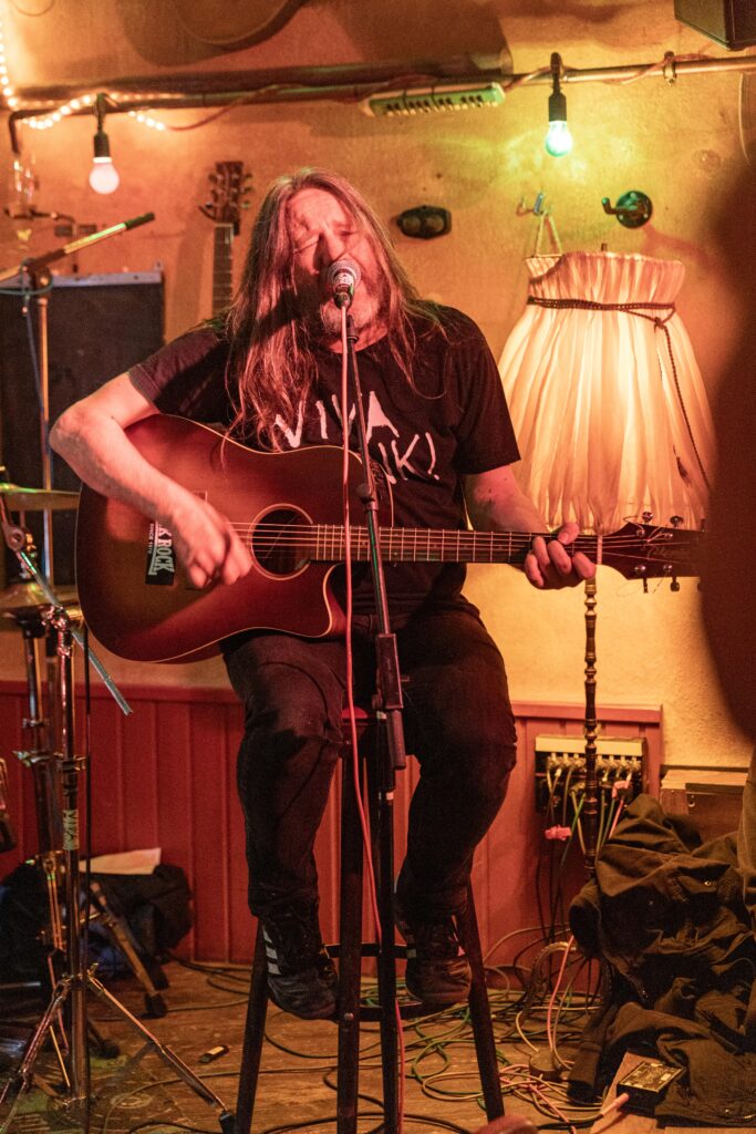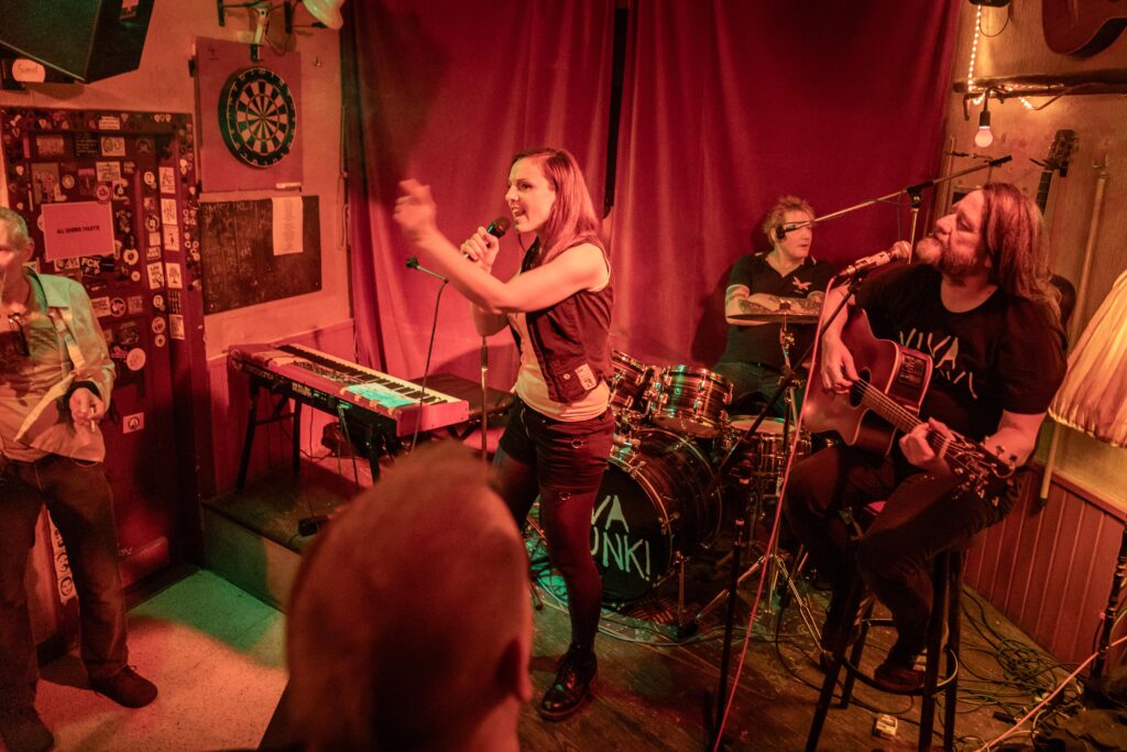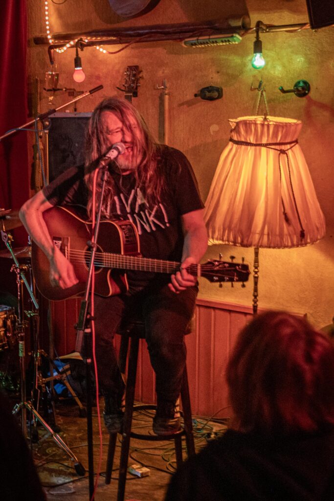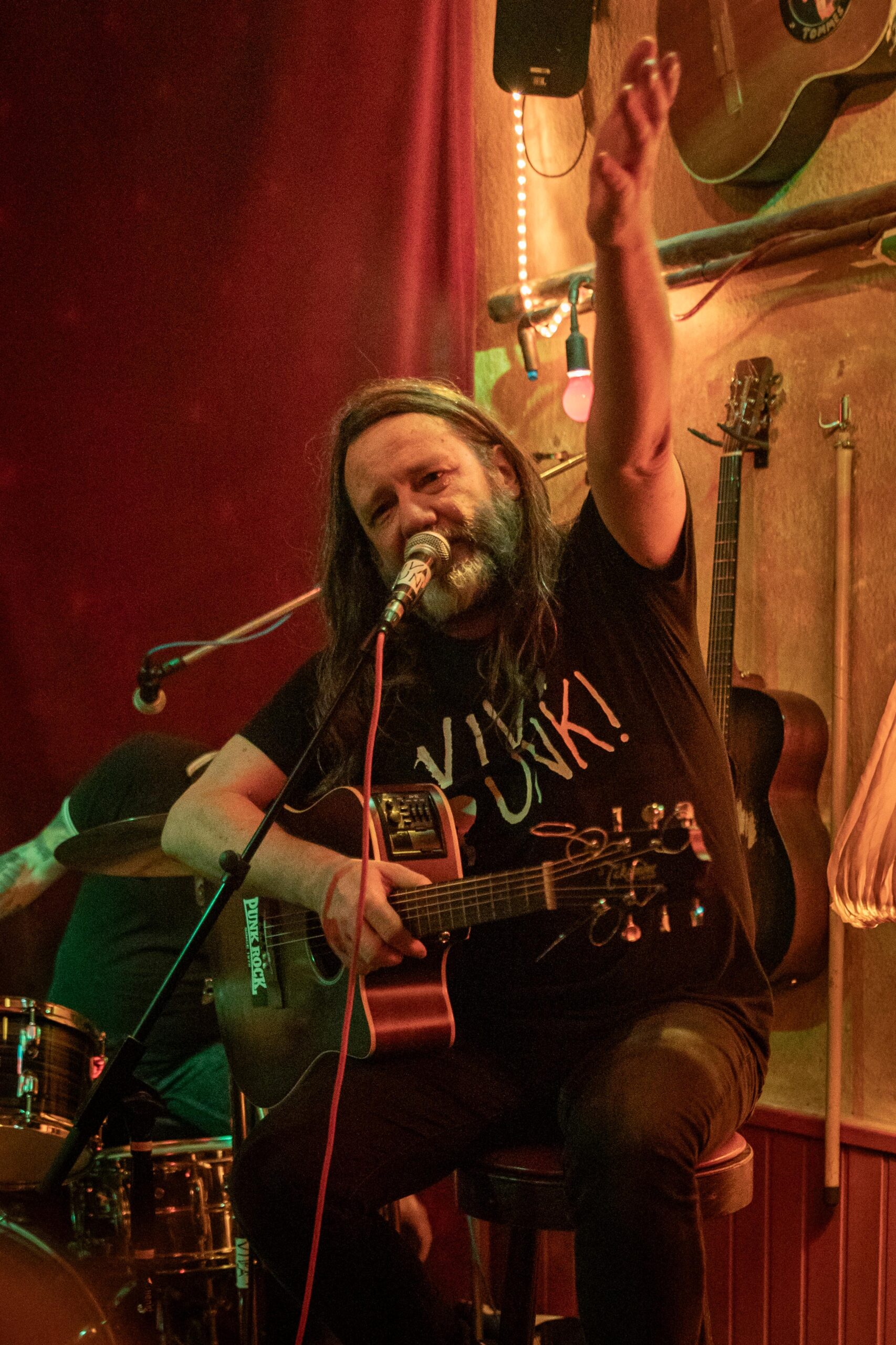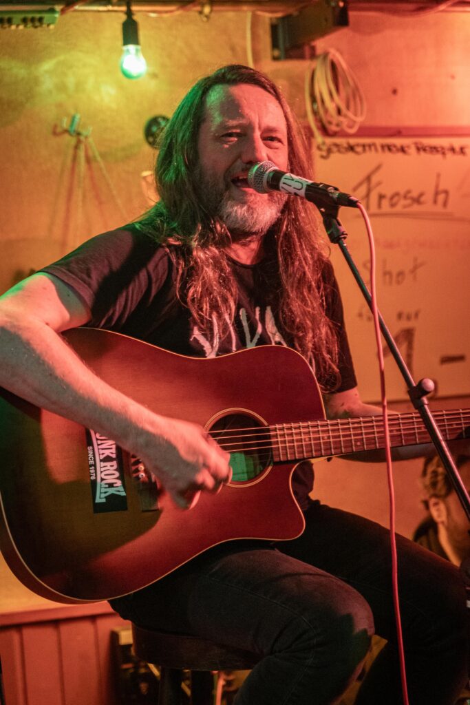 Eintritt war frei, ein Hut ging rum, der auch recht gut gefüllt schien. Sauber! Mit „Blitzkrieg Bop“ ging’s los, doch der Darmstädter Pöbel brauchte noch zwei, drei Songs, um richtig auf Temperatur zu kommen. Das kommt halt davon, wenn der Veranstalter zu geizig für eine Vorband ist, haha. Nach Hits von TV Smith und den Ärzten (oder waren es doch die Suurbiers?) wurde dann doch ziemlich schnell auch in den hinteren Reihen mitgeträllert. Drummer Berny machte ein paar böse Ansagen, die ihn fast den Rausschmiss aus der Band gekostet hätten. Aber mal ehrlich: Wer sein Bier so elegant in einer Gitarrenhalterung abstellen kann, den wirft man nicht einfach so raus. Niemand in der Kneipe hatte erwartet, dass das den ganzen Abend gut geht. Die Stimmung kippte nochmal ganz kurz, als irgendein Honk auf die Bühne gebeten wurde, um die „Schwarzwaldklinik“ von den Toten Hosen zu singen. War aber zum Glück schnell vorbei, und nichts ging zu Bruch.